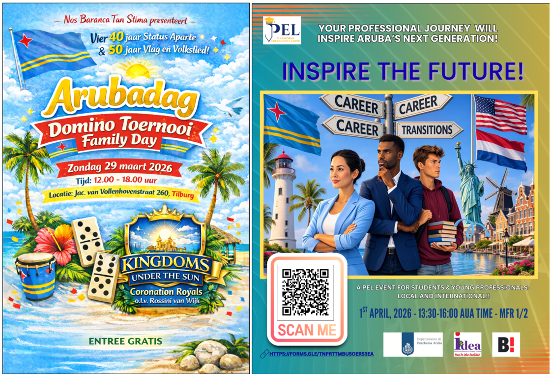 Kabinet van Aruba kan terugkijken op een succesvol Politiek Café10 maart 2026Kabinet van Aruba kan terugkijken op een succesvol Politiek CaféEerste werkdag Gevolmachtigde Minister Mildred Schwengle6 maart 2026Eerste werkdag Gevolmachtigde Minister Mildred SchwengleMildred “Milly” Schwengle benoemd als Gevolmachtigde Minister in Nederland5 maart 2026Mildred “Milly” Schwengle benoemd als Gevolmachtigde Minister in NederlandKabinet-Jetten beëdigd23 februari 2026Kabinet-Jetten beëdigdROC Mondriaan en Aruba versterken samenwerking rond eerste grote mbo-onderwijsvernieuwing in meer dan vijftien jaar30 januari 2026ROC Mondriaan en Aruba versterken samenwerking rond eerste grote mbo-onderwijsvernieuwing in meer dan vijftien jaarZoekenVeel bekekenKabinet van Aruba kan terugkijken op een succesvol Politiek CaféEerste werkdag Gevolmachtigde Minister Mildred SchwengleMildred “Milly” Schwengle benoemd als Gevolmachtigde Minister in NederlandKabinet-Jetten beëdigdROC Mondriaan en Aruba versterken samenwerking rond eerste grote mbo-onderwijsvernieuwing in meer dan vijftien jaar Wonen, werken en studeren in ArubaHet wonen, werken en studeren in Aruba als niet geboren Arubaan is aan regels gebonden.Meer informatie Wonen, werken en studeren in NederlandWonen, werken en studeren in Nederland als student uit Aruba opent de deur naar een wereld vol kansen.Meer informatie Reizen naar ArubaReizigers die naar Aruba afreizen moeten in het bezit zijn van een geldig paspoort uitgegeven in het land van herkomst.Meer informatie VideoMeer video’s Jouw bedrijf starten en laten groeienWil je ondernemer worden? Lees hoe je aan de slag kunt met je bedrijf.Meer over ondernemen